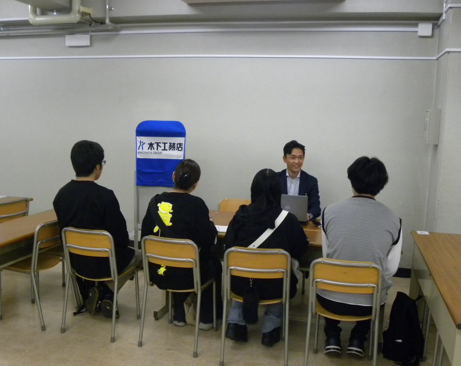 別室では、企業様に4つのコーナーに分かれていただき、合同企業懇談会を実施しました。不動産、運輸、商社、環境サービス、といったそれぞれの業界の概要説明をいただき、実際の営業職の仕事内容についてリアルな声で語っていただきました。参加学生からは、営業職に描いていたネガティブな印象がかなり払拭された、という声が多く聞かれ、これから本格化するインターンシップへの参加に勢いがついたことでしょう。